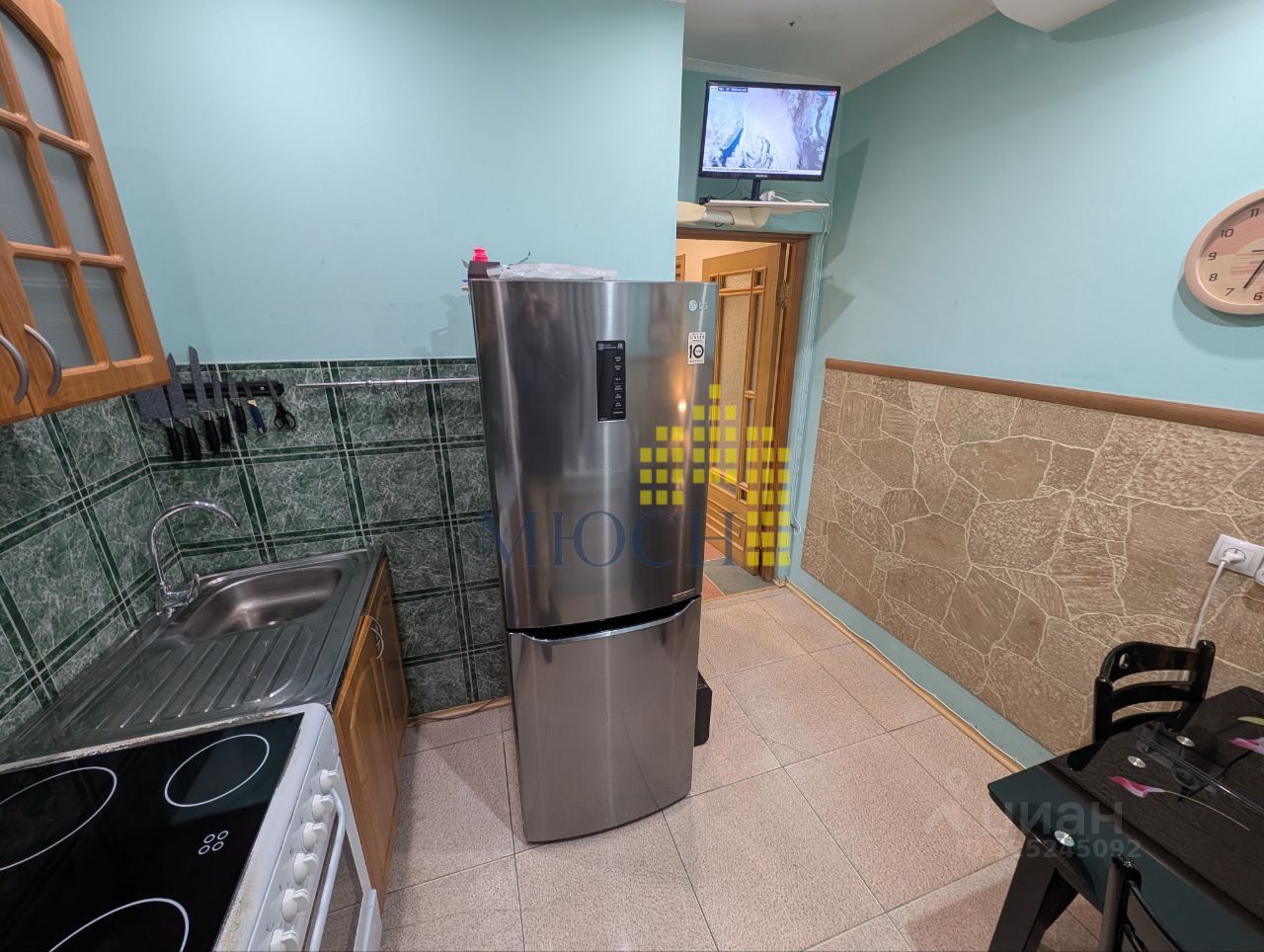 Сантехника новая, канализационный стояк в хорошем состоянии. Проводка частично заменена. Потолки: в комнате - натяжной, на кухне - гипсокартон с софитами, в прихожей - Армстронг, в санузле - реечный. Полы прихожая - декотайл, кухня и туалет - кафель,в комнате - линолеум.
